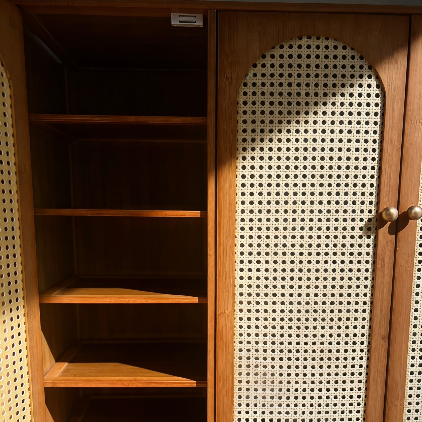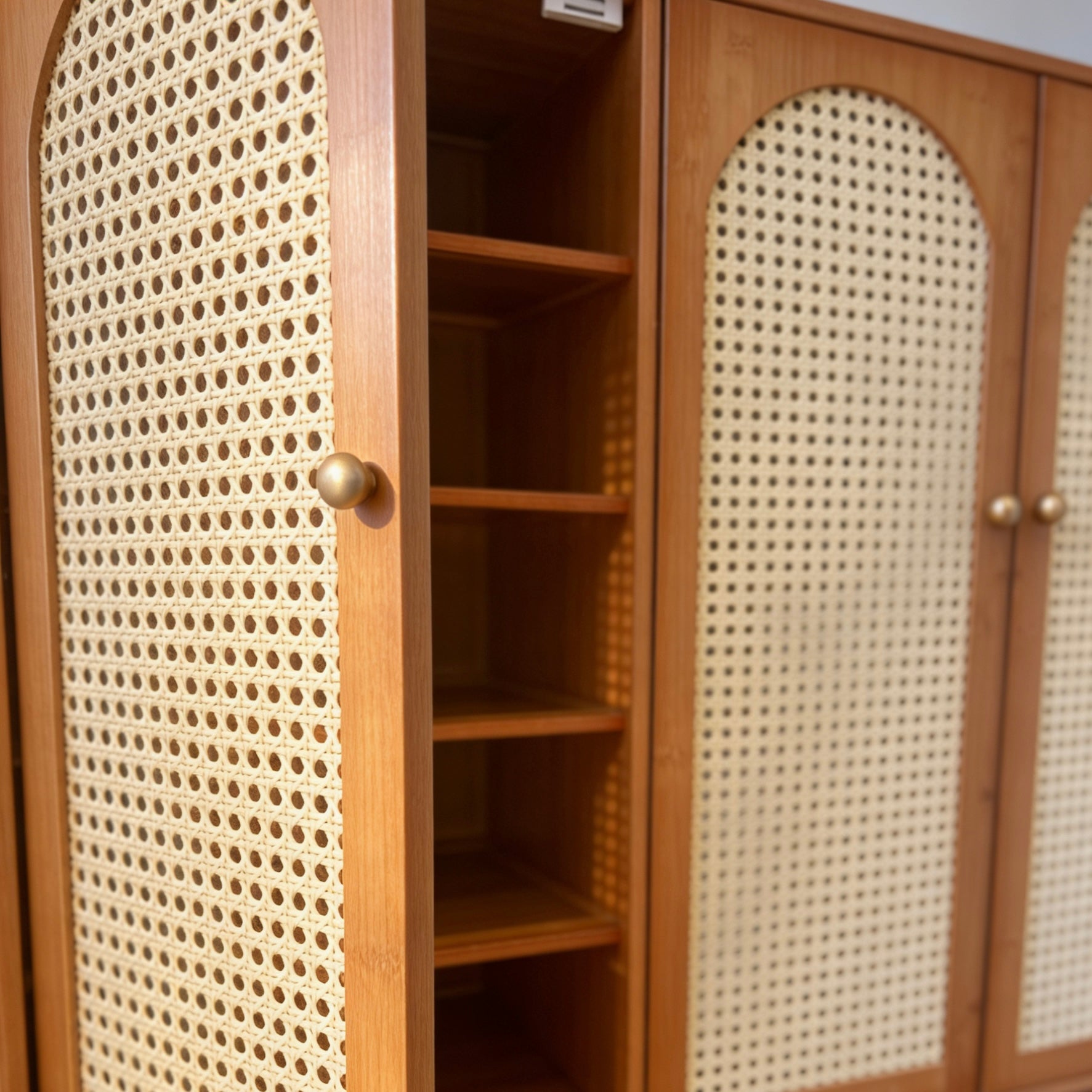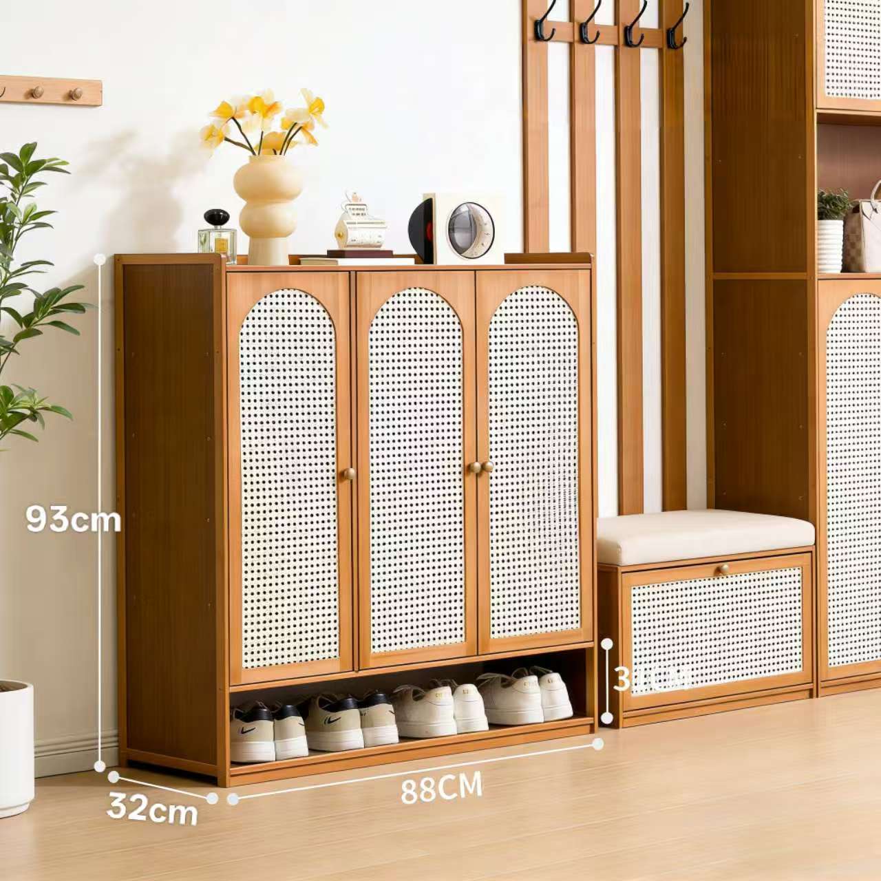 This cabinet comes with 7 layers of shelves, providing organized storage for a wide variety of footwear. The three-door design, complemented by the semi-transparent plastic ratten, adds a modern touch, allowing you to keep your shoes dust-free.